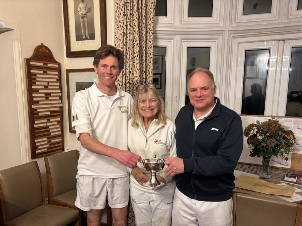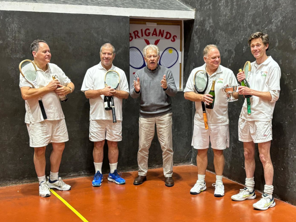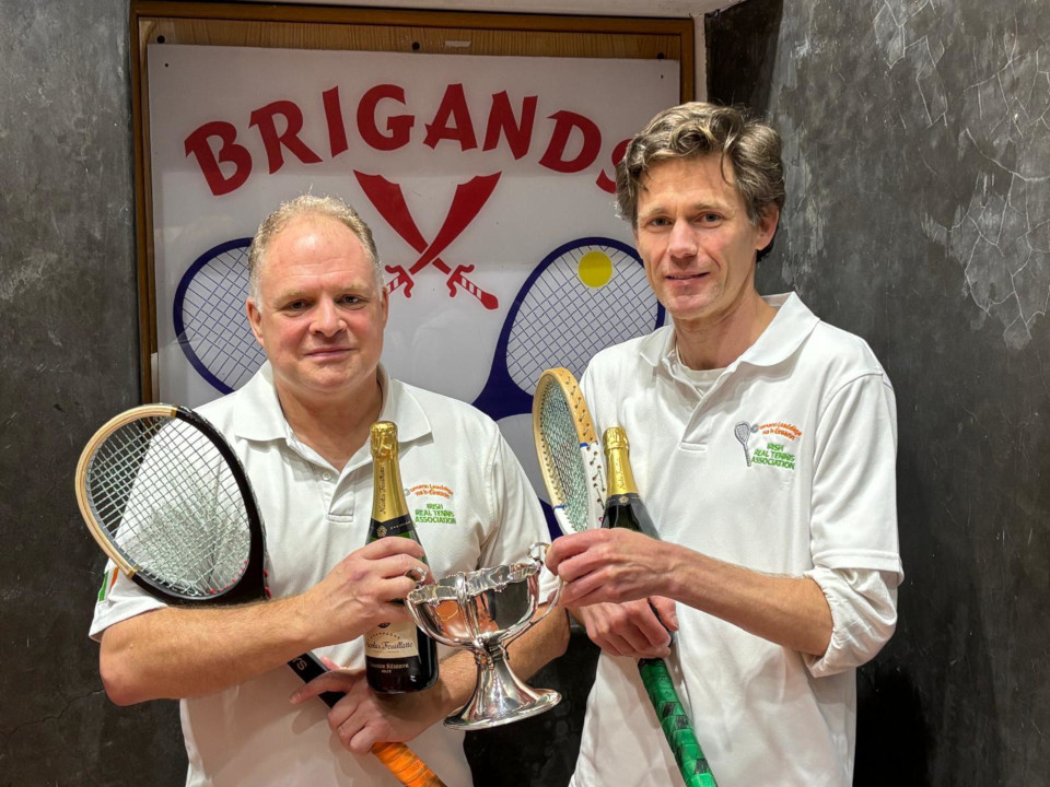![]() The IRTA visited the real tennis court at Hardwick House on Saturday 25 October to compete in the 2025 edition of the Brigands RTC handicap doubles tournament for peripatetic clubs. The IRTA pair, Roland Budd and Stuart Kerr, enjoyed a strong start in their opening match, at one point leading the Army pair by 5 games to 2. But the opposition seemed to improve, and indeed they ultimately prevailed by 8 games to 7. If the IRTA were to have any hope of progressing to the semi-final, they had to win their other group match, against the Jesters. Again the IRTA led by 5 games to 2, and again their opponents mounted a revival. On this occasion, however, the IRTA stretched their lead and emerged as winners by 9 games to 6. A period of uncertainty followed, as the outcome of the group depended on the result of the final match, between the Army and the Jesters. The experienced Jesters pair won, so each pair had won one match and lost one match. The IRTA progressed — but only just — on the countback. In the semi-final the IRTA pair started more slowly, falling to 1–3 against the Hurlingham Pigeons in the early stages but then reviving to take the match 6–3. The other finalists were the holders, the Bar RTC (featuring IRTA member Peter Dean), who had dominated their group but come through a closer semi-final against the Dedanists (featuring IRTA member Chris Marguerie). The IRTA ultimately dethroned the holders, winning the final by 6 games to 2. Many thanks to Malcolm Thorp and the Brigands for inviting the IRTA to play in this tournament over the years, to Victoria for excellent food throughout the day, and to Lesley Ronaldson for a long day of marking. Report from Malcolm ThorpIt was great to have many of the regulars playing and also have a number of new participants join us. As always, the play was competitive and often closely contested, with some wonderful rests, great forces and the occasional lucky shots! We had some last minute replacements: many thanks to two Brigands, Ian Machin and Derrick Wells for stepping in to replace Oliver Harris and me, and to Charlie Bashall (definitely future Brigand material!) who played for the Army - without them, the tournament would not have worked. Joining the Dedanists at the sharp end of the tournament, were three former winning clubs: the Hurlingham Pigeons, the Bar and the IRTA (all three had won the tournament twice before). After hard fought semi-final matches, the final saw the Bar taking on the IRTA. Despite the Bar’s skill, great efforts and grit, the IRTA prevailed and took home the first prize of the champers and the right to have their names engraved again on the solid silver cup, which they can retain and display on their mantelpieces for the next twelve months. Well done to them and to the Bar, who were worthy runners up, and to all who played in great spirit and highly competitively. As usual, our huge thanks to both Lesley Ronaldson for her excellent marking and to Victoria for catering throughout the day (and to the very many of you who helped). Finally, we would not be able to hold this annual tournament were it not for the generosity of the Friends of Hardwick Tennis Court who let us use their court the whole day and evening – thank you. We hope to see you all again in 2026! Photos